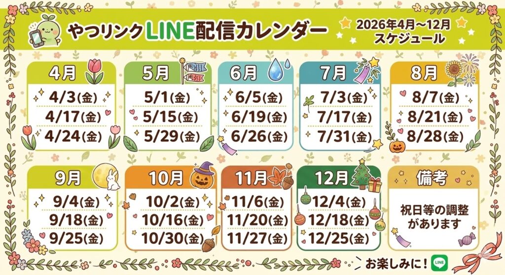 2026年4月より、やつリンクのLINE配信回数は 月3回 となります。